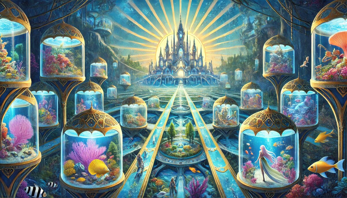 Если посмотреть на город с высоты, а точнее с поверхности воды, то он по своей структуре будет напоминать солнце. В центре дворец Повелителя. Он окружен огромным парком. Любимым местом прогулок жителей подводного мира. В этом смысле нравы тут демократичные, парк открыт для всех. За парком располагалась торговая зона. Этакое кольцо из разных лавочек и магазинчиков, которое пронизывают те самые лучи-дороги. Отдельной касты торговцев здесь нет, и свою продукцию продавали сами ремесленники, земледельцы, охотники и рыбоводы. Торговля была сосредоточена в одном месте, удобно. За торговым кольцом — жилые кварталы, тут уже существует четкое деление на сектора в зависимости от касты. На самой окраине города располагаются ремесленные мастерские, поля и места разведения подводной живности.