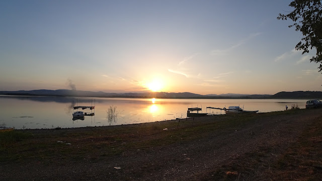 Проезжая город Крагуевац спросил у местных нормальное ли место для остановки с палаткой на Гружанском озере и услышал положительный ответ. Рассказали куда свернуть. Но подъехав к озеру, встретили неприступную территорию, занятую частными домами. Немного потыкались и не найдя подъезда к воде решаем вернуться в ближайший посёлок Книч. От него есть дорога на север озера и мы по асфальту, а потом по размытой водой лесной гористой дороге спустились к озеру. (43.94484227327186, 20.696695296907546). В метрах тридцати от берега вдоль озера стояли деревянные времянки или старые кемперы. Всё это располагалось среди деревьев и напоминало резервацию. Мы подъехали к удобному месту для стоянки, но оно было практически у забора местного вигвама. Небольшая полоска с травой и более менее ровной поверхностью, дальше наклон, накатанная дорога, ракушечник и озеро. К нам вышел мужчина лет 50-ти. Мы спросили разрешения поставить тут палатку и он ответил что мы без проблем можем поставить её в любом удобном месте. Потом появился ещё один мужчина у которого на берегу были заброшены удочки и стояли звуковые сигнализаторы на поклёвку. Мы перезнакомились и условно были приняты в местную банду. А чтобы закрепить наше знакомство пожилой рыбак, который неподалёку сидел в пришвартованной лодке, поднёс нам свой самогон на сливе, сливовицу. Пришлось скрепить дружбу народов. Мы поставили палатку и пока Алеся чистила пёрышки я в сопровождении Милоша пошёл купаться. Он показал где можно безопасно проходить по дну, так как всё дно усыпано ракушечником и легко можно порезать ноги. Но я то сначала этого не знал и пошёл в воду босиком. А когда я вышел на берег и они увидели что я без шлёпок, то за переживали за меня. Пришлось обследовать ступни на порезы, но всё обошлось. Вскоре у Милоша сработала поклёвка и мы вместе побежали вытягивать кита. Он вытянул небольшую рыбёшку и сказав что пусть ещё растёт, выпустил её в озеро.