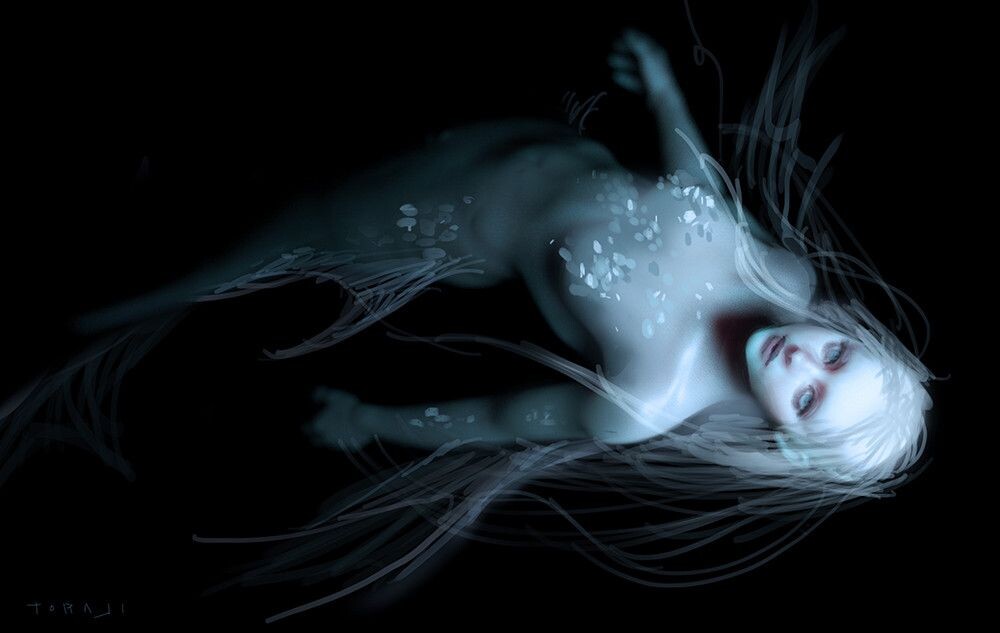 На дне озера лежит обнаженная девушка какой-то невозможной красоты - мраморная кожа, идеальная фигура с высокой грудью и тонкой талией. Длинные белокурые волосы слегка колышутся под водой.