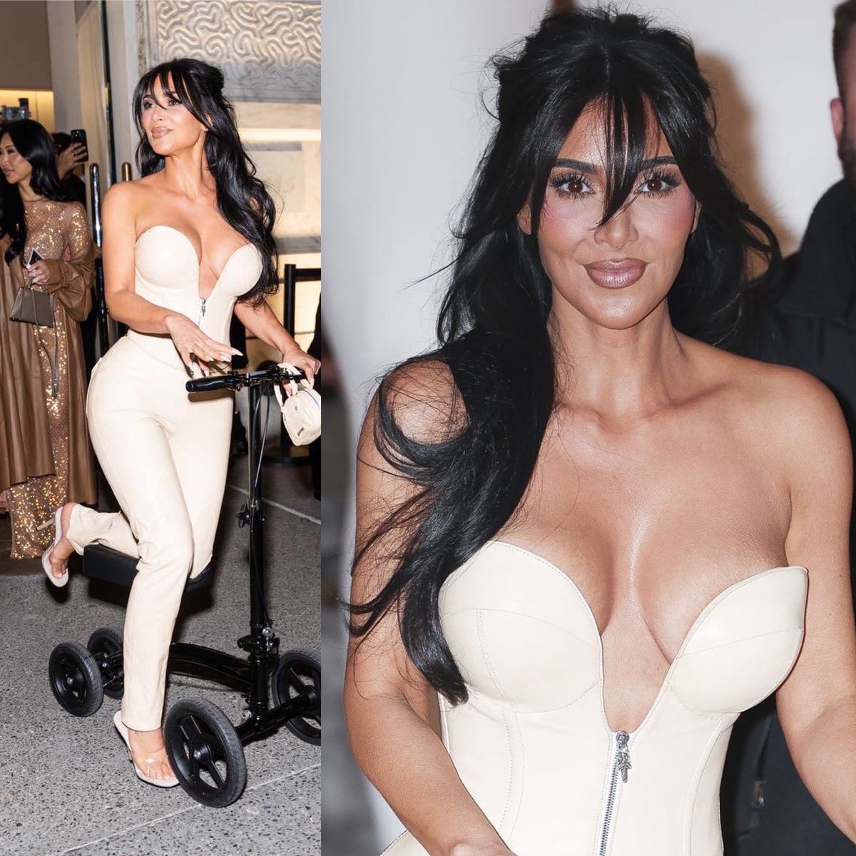 Новый флагманский магазин SKIMS на Пятой авеню встретил не только восторженную толпу поклонников, но и свою главную звезду – Ким Кардашьян. И, конечно, она сделала это в своем фирменном стиле – даже со сломанной ногой. Вечером 12 декабря 44-летняя бизнес-леди и звезда шоу The Kardashians появилась на открытии бутика в кремовом комплекте, который с первого взгляда захватил внимание публики. Корсетный топ со структурированным силуэтом, глубоким декольте и серебряной молнией стал центром образа. Брюки в тон завершали этот минималистичный, но ультрасексуальный лук, создавая эффект «второй кожи». Гламур выше боли Но главное, что выделяло Ким среди остальных гостей, — это не только ее наряд, но и способ передвижения. Перелом ноги? Ерунда! Кардашьян эффектно прокатилась через толпу фанатов на специальном самокате, который стал её «транспортом» после недавней травмы. И да, вы не ослышались: она сделала это в прозрачных туфлях на каблуке. Как говорится, боль пройдет, а стиль – навсегда. Её обр