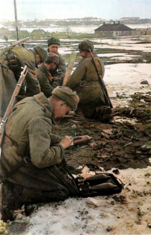 Минометный расчет РККА поддерживает огнем продвижение пехоты где то в районе Курска в феврале 1943г. У двух минометчиков трофейные патронные подсумки. На переднем плане боец работает с шестиперой осколочной миной О-832 которую он достал из трехсекционного металического лотка. Мина оснащена бакелитовым взрывателем ( МП - миномётный пластмассовый). Такой взрыватель обеспечивал большую скорострельность чем взрыватели М-5 и М-1 потому что нет необходимости свинчивать предохранительный колпачок. #история #война #солдаты