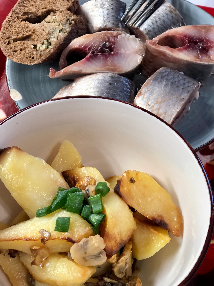 В продолжение вчерашнего поста рассказываю про свой субботний обед. Вчера промотались по городу по делам, потом заехали в «Ленту» за продуктами. И там попались мне на глаза селедочные развалы. Ее, красавицу нашу, только что выложили на витрину, толстенькую, жирненькую, в пряном посоле. Муж не любит селедку, а я не смогла удержаться и купила себе одну, пузатенькую, с икоркой. А тут и витрина с "горячим" нарисовалась. Как не взять к селедочке картошечку по-деревенски, с грибами? Лучок зеленый свой, из заморозки. Классика жанра - правда же? Что может быть вкуснее горячей картошки и пряной холодной селедки? Вот они, грибочки, и поджарочка) Ну это ли не чудо чудное, вкуснятина и свежатина! Чего еще не хватало, то само в руки попало. У нас этот хлеб называется "половинка багета с зеленью и чесноком". Хлебушек внутри еще тепленький, а сверху-хрустящая корочка. И он уже надрезан "шайбами", чуть наискось, представляете запах?. Вот такой шикарнейший у меня был обед в субботу. Не надо и изысков