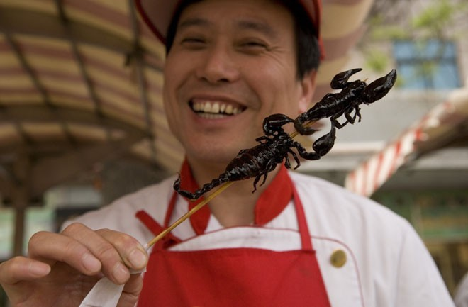 Некоторые из его конкурентов продают больших черных жареных скорпионов или термитов, пауков, цикад и других существ.