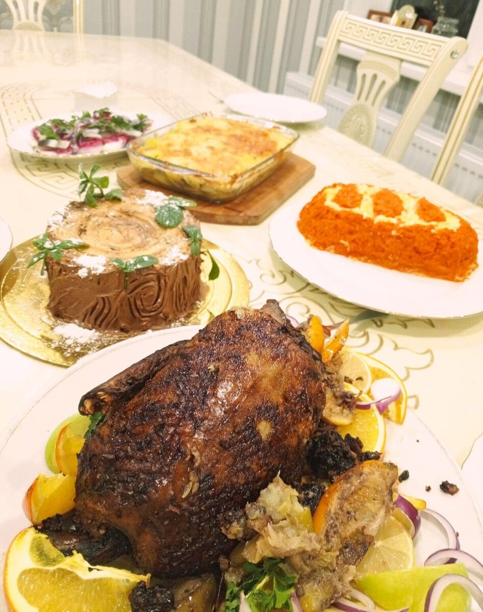 Утка, запеченная с яблоками и апельсинами