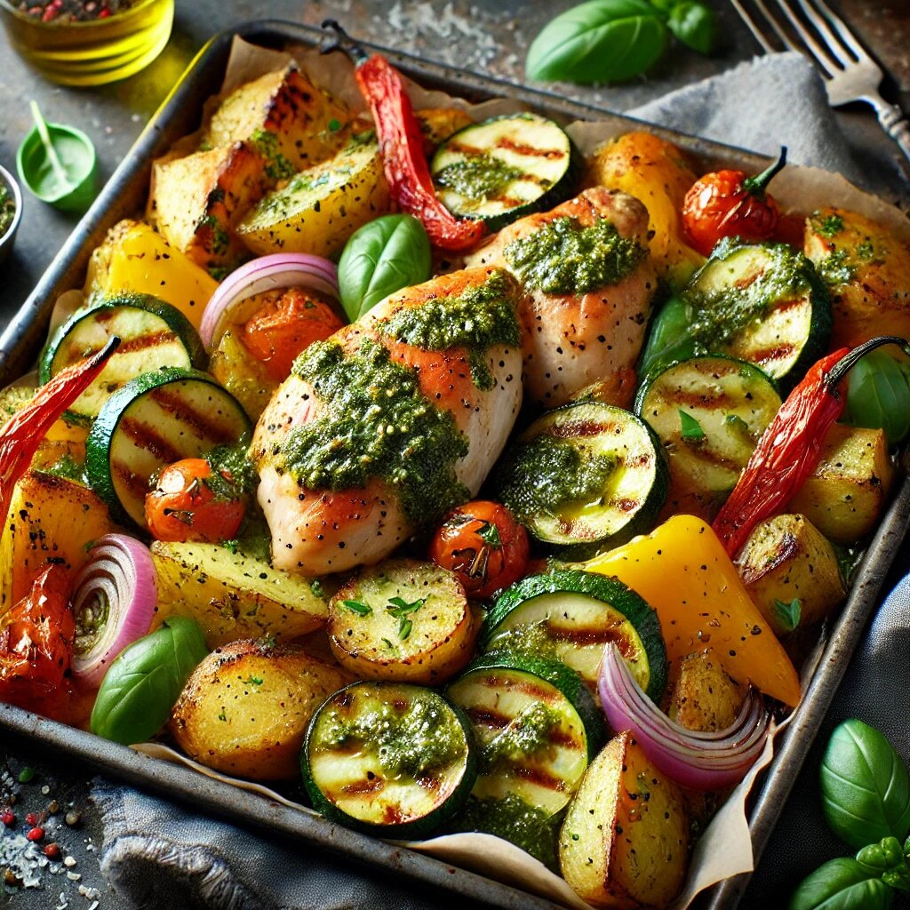 Это лёгкое и вкусное блюдо готовится быстро и идеально подходит для ужина. Сочетание запечённых овощей, сочной курицы и ароматного соуса песто порадует всех за столом. Для более насыщенного вкуса добавьте в блюдо немного черри-помидоров или замените картофель бататом. Вопрос к читателям: