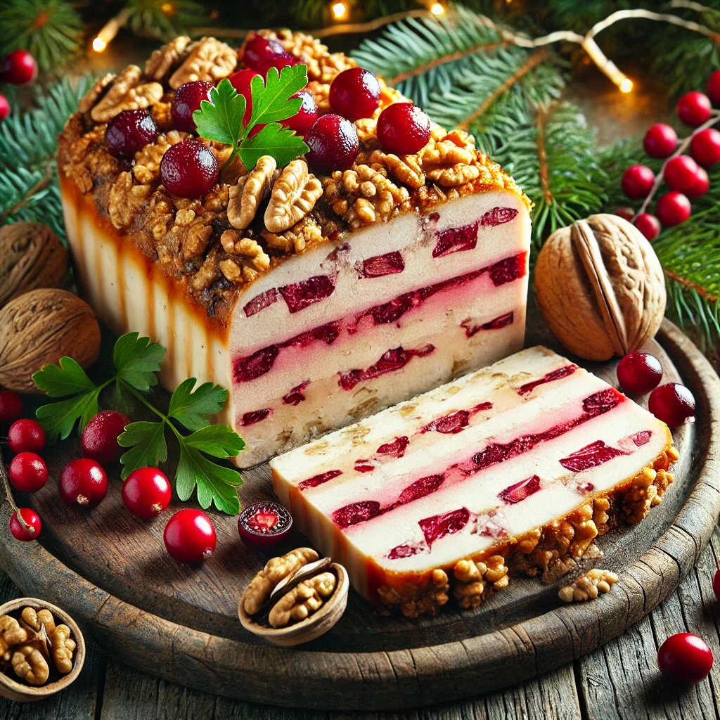 Этот террин — настоящее украшение новогоднего стола. Он сочетает в себе нежное куриное мясо, орехи и лёгкую кислинку клюквы. Для более насыщенного вкуса добавьте немного тертого сыра или копчёного бекона в фарш. Вопрос к читателям: