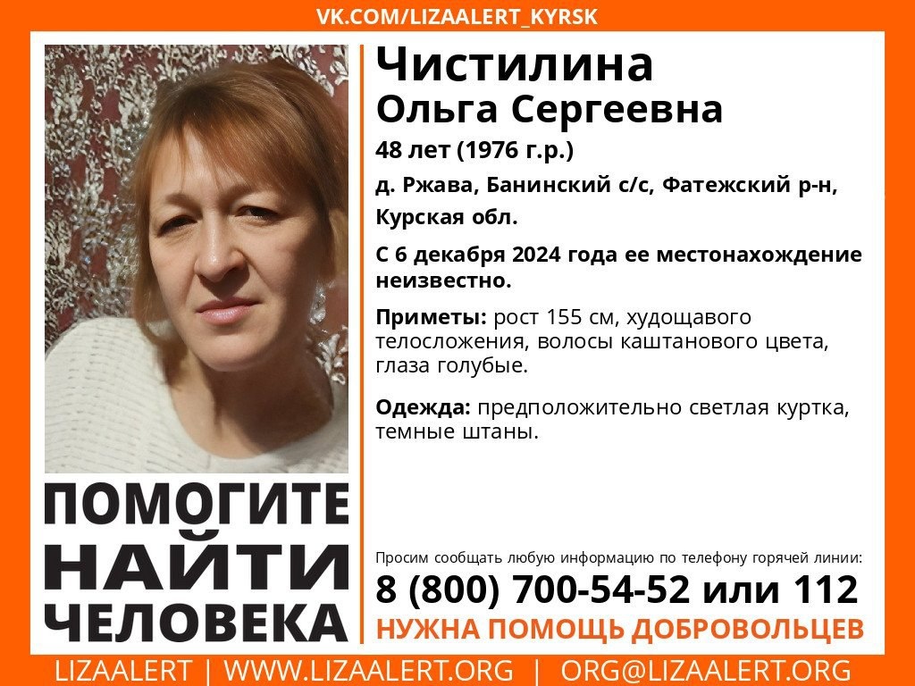 Пропавшую Ольгу Сергеевну Чистилину ищут волонтёры поисково-спасательного отряда «Лиза Алерт». Её местонахождение неизвестно с 6 декабря.