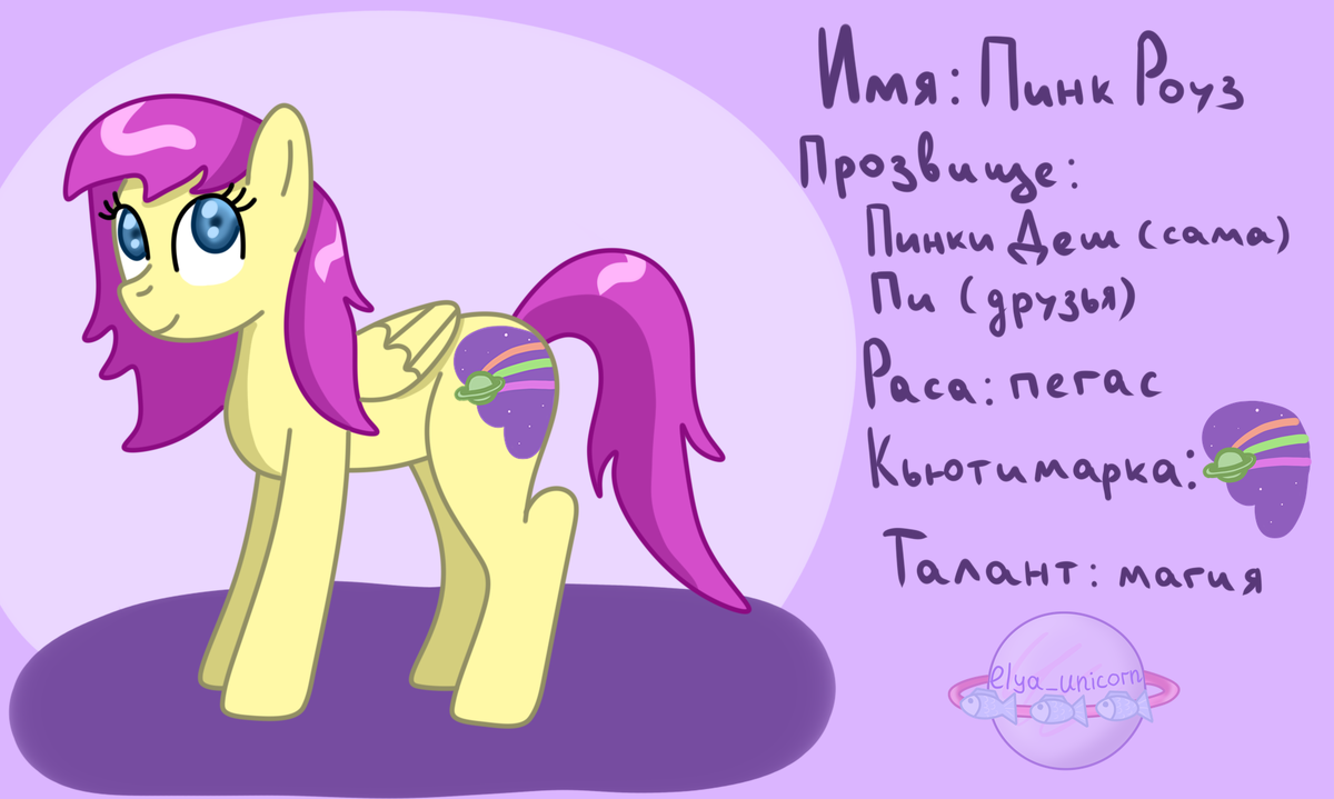 В общем, сейчас Пи (это прозвище, кстати, дали мне и моей ОС мои старые интернет-друзья) зовётся Пинк Роуз. Это имя ей дали родители из-за её насыщенно-розовой гривы.