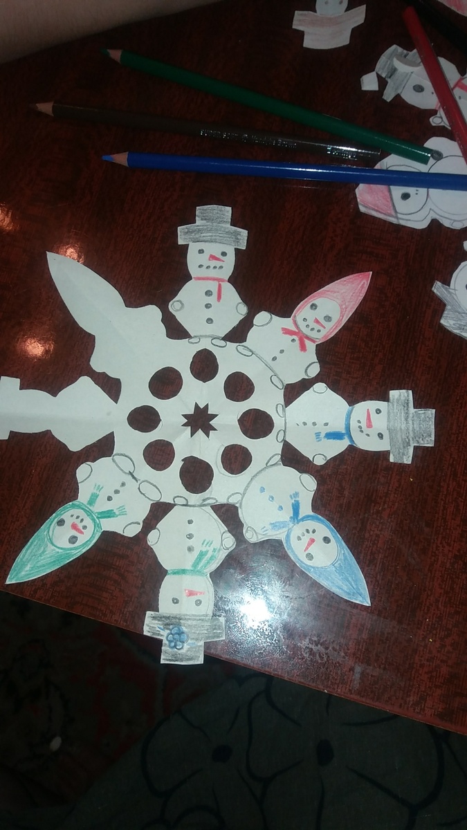 Внучка сегодня учила меня вырезать снежинки! Не простые снежинки, а снеговиковые! Оказываются бывают и такие, а я столько лет прожила на Этом Свете и не знала...)) Для такой снежинки мне понадобился простой альбомный лист бумаги. Белой. Потом я поняла почему-совсем не потому что снежинка белая, а потому, что снеговиков на этой снежинке можно раскрасить!!! Главное, это сложить прааильно лист и вырезать только там, где НАДО вырезать! После развертывания вырезанной заготовки получаются снеговички по кругу. Мальчики и девочки). Вот их и надо раскрасить карандашами! Что я и сделала под чутким руководством внучки.))) Прелесть, а не снежинка!)) Надо будет еще несколько сделать, что бы на Новый год украсить квартиру. Саму схему выкладывать не буду, думаю она есть в интернете. Если кому надо будет-спрашивайте. В комментариях напишу. С наступающим Новым годом, дорогие! Хорошее настроение делаем себе сами. Несмотря ни на что (особенно на то, что творится в Мире). Будем потихоньку возвращать Д