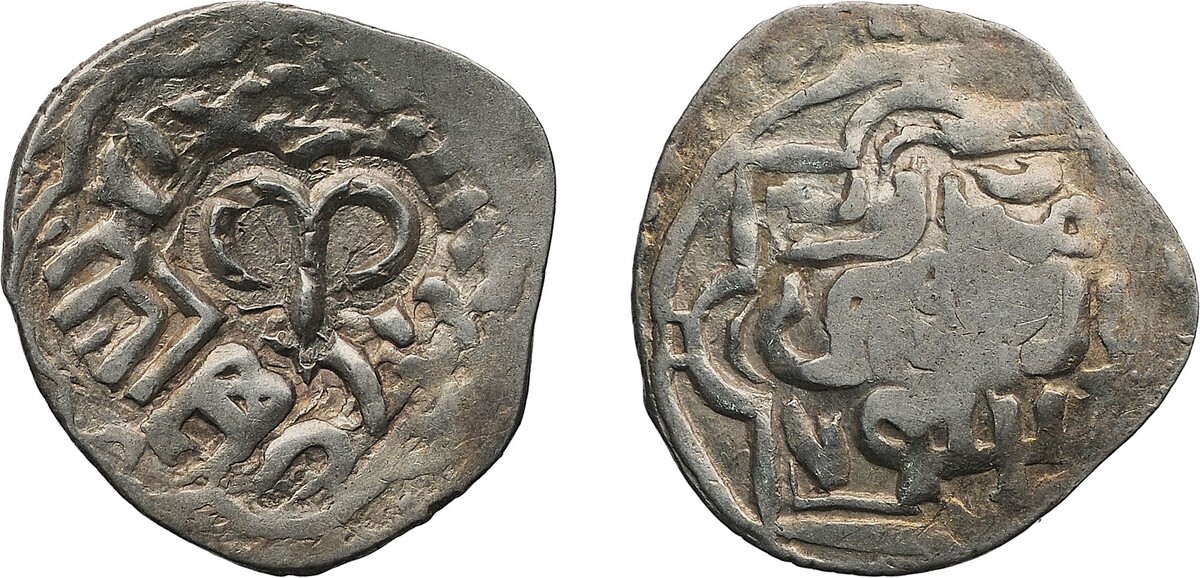 Описание: надчеканка рязанской тамги на легенде с именем хана Тохтамыша. Вариант: "безглазая" тамга.