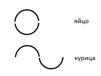 Выражение «сдвиг по фазе» даёт рисунок яйца как половин круга-периода и курицы – как её учат рисовать в детсаду и школе – периодом синусоиды. Сдвиг – снос, снесение – синусоида. Курица-яйцо – кривиться-явиться. Это виды спирали сбоку и с торца: торец-бок – творец-бог. При написании буквы Т крестом (t) получается сходство с Х, т.е. творец – хрц – курица как корча-кривизна-овал. Бок-торец – бука-творец – «явец» – яйцо – род-период. Сдвиг по фазе = дурь, спятение. КуРиЦа – КРиК – вибрация; яЙЦо – ЗоВ – вибрация. Курица = яйцо. Эту схему можно читать и как Мировая Утка с камнем-комом, где сокращение Мировая Утка = МУ, а ком = «ка ом», т.е. оба направления чтения звука творения АУМ.
