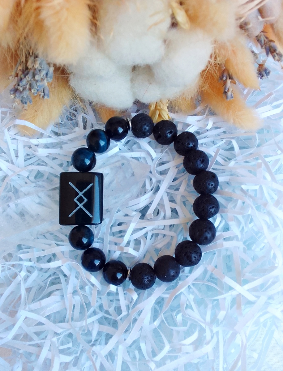 Браслет «Энергетическая защита и финансовый успех» состоит из натуральных камней соколиного глаза, вулканической лавы и русской руны «Защита». Русская руна «Защита» помогает человеку обезопасить себя от неприятностей, любого негативного влияния злых людей, завистников, раскрыть свой творческий потенциал, «выйти из тени», набраться мужества и умения отстаивать свою позицию. Является оберегом защиты и символом удачи в делах, в том числе и финансовых. Руна «Защита» способна уберечь не только самого человека, но и его благосостояние от злых и завистливых людей, от наложения сглаза и порчи. Она помогает избавиться от врагов и двуличных людей, развивает в человеке силу воли, умение противостоять трудностям, выносливость, смелость и отвагу. Также руна «Защита» пробуждает в человеке чувство ответственности за свои слова и поступки. Соколиный глаз помогает обрести интуицию, веру в себя и в свои силы, ясность мышления и уверенность в принятии решений, направляя мысли в продуктивное русло. Дл