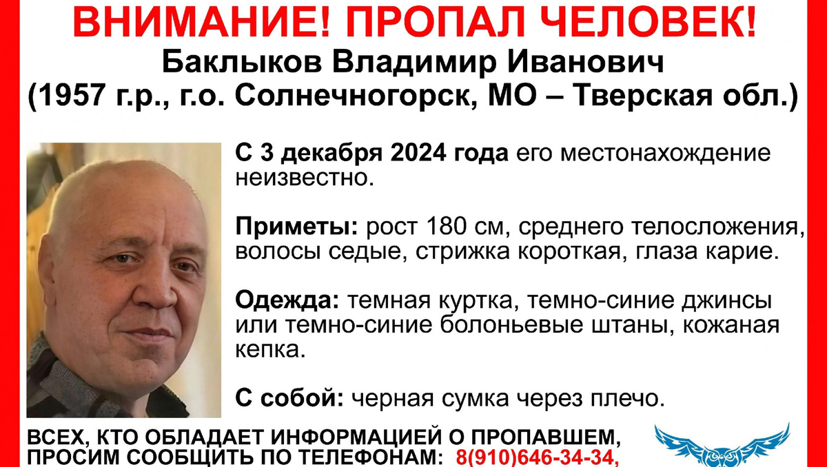 Тверские волонтеры ищут пропавшего 67-летнего Владимира Ивановича Баклыкова. Как сообщает тверской волонтерский поисково-спасательный отряд "Сова", местонахождение мужчины неизвестно с 3 декабря, может находиться в Тверской или Московской областях. Приметы: рост 180 см, среднего телосложения, волосы седые, стрижка короткая, глаза карие. Одежда: темная куртка, темно-синие джинсы или темно-синие болоньевые штаны, кожаная кепка. С собой: черная сумка через плечо. Волонтеры просят жителей сообщать информацию о пропавшем в отряд по телефонам: 8 (910) 646-34-34, 8 (904) 014-12-34