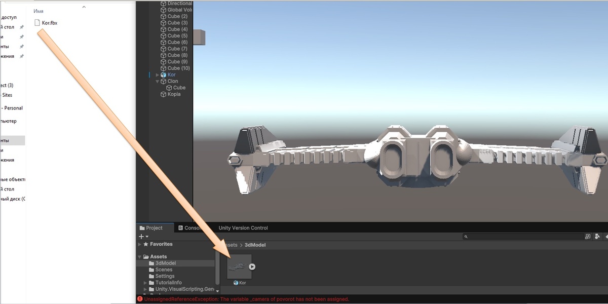 Когда придёт время для того чтоб добавить 3D модель в наш проект юнити хорошо бы иметь опыт роботы с программой Blender . B Unity модели добавляются с расширением файла FBX. Blender позволяет редактировать, создавать 3D модели и сохранять (экспортировать) в файлы с расширением FBX. Также можно в программу Blender импортировать файлы с расширением (dae,abc,usd*,obj,stl,fbx,x3d, . . . .) Определившись какая модель нам нужна ( в моём случае космический корабль) ищем в интернете. Обращаем внимание на расширение файла для скачивания , если всё подходит скачиваем модель . Открываем модель в блендере редактируем, маштабируем, поворачиваем и сохраняем (экспортируем) в формат fbx. Запоминаем где сохранили файл , находим на компьютере наш файл с расширением fbx и перетаскиваем его в наш проект После чего можем добавить на сцену нашу 3d модель Я прицепил к объекту камеру и скрипт управления моделью . на сцену добавил несколько кубиков и разместил их в разных местах и запустил . Ну вот я
