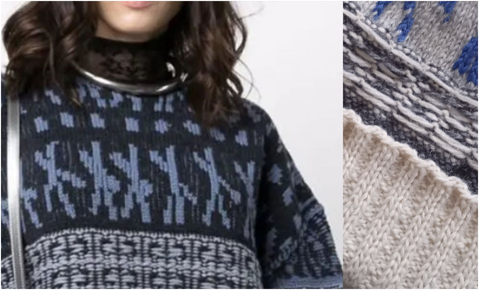 Шапочка вязалась по мотивам джемпера Живанши, который показан на фото ниже. Особенность джемпера в том, что часть жаккардовых узоров связана изнаночной стороной налицо, а часть связана, как обычно. Получается, что часть жаккардовых узоров расположена протяжками наружу, что придает джемперу необычный и оригинальный вид. Мне показался интересным такой прием и, я решила, для разнообразия, попробовать связать в этой технике шапочку.