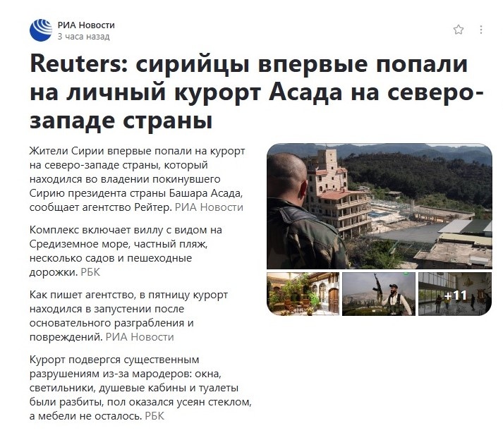Частенько задумываюсь - что за люди придумывают заголовки для новостных сюжетов и кто их редактирует? Давно пора собирать коллекцию. Вот вчера читаю, в первых строчках Яндекса - «Жители Сирии впервые попали на личный курорт Асада на северо-востоке страны…». Любопытная фраза. То есть, до этого никаких сирийцев на этом курорте не было? Ни служащих, ни охраны? А семье Асадов известное агентство уже отказывает в праве считаться сирийцами? Ловко придумано. Но что же это за курорт такой удивительный, куда по сообщению наших креативщиков не ступала нога сирийца в принципе? Итак, сообщается, что курорт находится в поселении Бурж-Ислам в провинции Латакия. На пятницу это место уже в запустении после грабежей. Окна выбиты, мебель утащена, всё остальное сломано. Ладно хоть в статье есть ссылка на «Reuters», так что лучше сразу перейти туда, так как наша статья не слишком информативна. Как сказано в «наших» новостях - «агентство добавляет, что местные жители в основном сирийские туркмены, пришли п