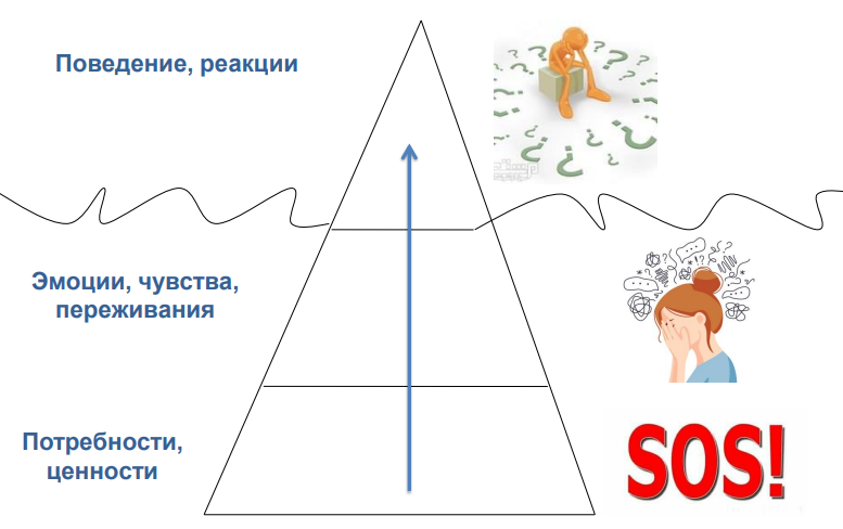 Приведем образец интерпретации написанного выше практического примера: «То, что у Вас происходит с ребенком – это верхушка айсберга. Вам это не нравится, приемы, которые Вы используете в воспитании ребенка, не работают. Но если мы обратим свой взгляд на основание пирамиды, то увидим, что Ваши потребности фрустрированы. У Вас положительные намерения - Вам очень хочется быть хорошим родителем, Вы любите своего ребенка. Но, когда он не слушается, ценность вашего «Я» страдает и это вызывает чувство обиды, злости и бессилия, которые «затапливают» Вас. Похоже, есть необходимость разобраться, как можно помочь себе чувствовать хорошо вне зависимости от того как ведет себя ребенок, а также, как можно совладать со своими эмоциями и чувствами, чтобы это не отражалось на ребенке.