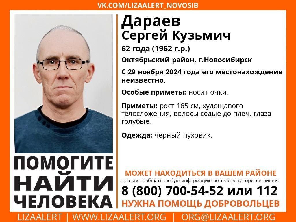 С 29 ноября местонахождение сибиряка неизвестно. В Октябрьском районе Новосибирска продолжают искать 62-летнего Сергея Дараева, который не выходит на связь с 29 ноября. Мужчина ушёл в неизвестном направлении, больше его никто не видел. Сообщается, что в день пропажи был в черном пуховике. Носит очки, как правило. Из примет: рост 165 сантиметров, худощавого телосложения, волосы седые, до плеч. Если вам что-либо известно о местонахождении пропавшего, сообщите по телефону горячей линии 8-800-700-54-52 (круглосуточно, бесплатно) или по номеру 112. Ранее Сиб.фм сообщал, что под Новосибирском пропала пенсионерка в сланцах, которая нуждается в медицинской помощи.