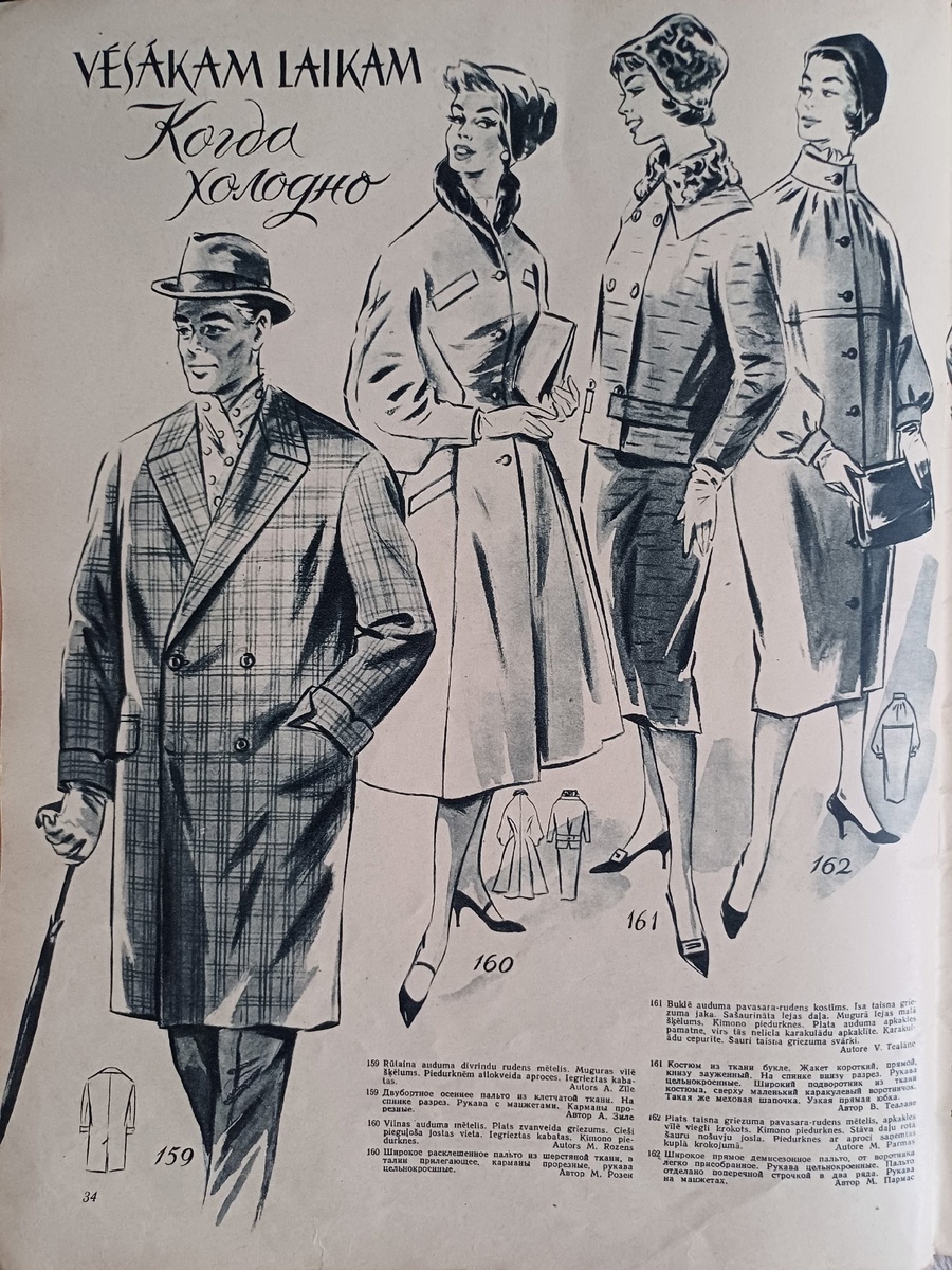 Влезая в теплый и уютный пуховик (желательно - с климат-контролем), мы радуемся, что тепло нынче лёгкое и в уходе не сложное. Но эстетику пуховика принимают не все... Впрочем, оставим дискуссию: у нас тут сегодня эстетика, кажется, бесспорная - рубеж 50-х - 60-х, кажется, любят все. Мужская мода всё ещё монументальна и основательна - но и Rigas Modes ориентируется не на юных - посмотрите, какие джентльмены на рисунках! Время такое - в мужчинах ценится солидность, основательность, профессионализм и... культура. В норме быть начитанным, ориентироваться в литературе, кинематографе, неплохо - в искусстве. Это время, когда при встрече мужчины слегка приподнимают шляпу, совершая лёгкий поклон головой, непременно снимают перчатку, здороваясь и спрашивают разрешения закурить у присутствующих дам. Женщины в это время ждут от мужчин проявления этикета: придержать дверь при входе, помочь снять пальто, придвинуть стул, подождать, пока сядет дама и затем сесть самому естественно, и совершаются э