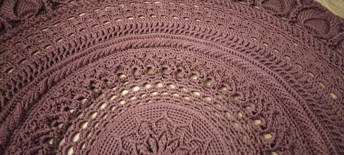 Ко мне обратилась девушка из Астрахани. Ей я уже вязала 2 ковра в подарок маме на 8 марта. Они были небольшими по 90 см. В этот раз она хотела на новый год маме подарить большой ковёр, в комплект к маленьким. С похожим дизайном, листочками. Но времени мало, а ковёр 220 см. Буквально на прошлой неделе я заказывала шнур и всё было в наличии, и цены были стабильными и привычными. Зашла посмотреть шнур к её заказу, а его нет. И как пишет производитель поставок не будет. Распродают остатки. Цены на остатки выросли. Не на сколько то процентов, а в два раза. В один прекрасный день всё изменилось. Но заказ я уже взяла и цену уже озвучила. На ковёр нужно 4 км шнура минимум, а на складах он бабинами по 100 и 300 метров. Скупила всё что могло поступить в пункт в течении нескольких дней. Вязала и дозаказывала ещё. В итоге хватило только на 190 см ковра. Себестоимость ковра почти такая же вышла как и стоимость. Плюс обработка латексом от скольжения и бесплатная отправка. Так как ковёр вышел мен
