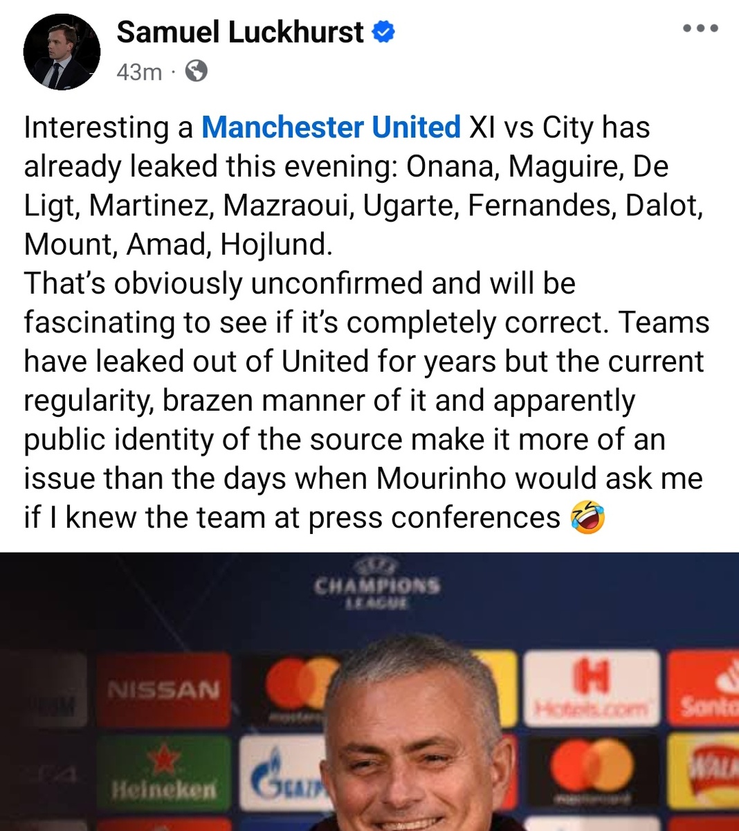 «Манчестер Юнайтед» подходит к выезду на «Этихад», занимая 13-е место в турнирной таблице Премьер-лиги. «Сити» тоже переживает не лучшие времена: с октября команда победила лишь в одном из десяти матчей во всех турнирах. Возможно, Гвардиоле будет проще готовиться к дерби, ведь за 17 часов до матча в интернете появилась информация о стартовом составе «красных дьяволов». Журналист Manchester Evening News Сэмюэль Лакхерст в своих соцсетях опубликовал состав «МЮ» на встречу: Онана, Магуайр, Де Лигт, Мартинес, Мазрауи, Угарте, Фернандеш, Далот, Маунт, Диалло, Хейлунд. Корреспондент добавил, что информация не подтверждена, но количество сливов из раздевалки манкунианцев становится тревожным. Твиттер-блогер с ником UTDdefence провел целое расследование и выяснил, что за сливами, вероятно, стоят Гарначо и его брат Роберто. Другие источники имен не называют, но также утверждают, что информацию сливает игрок основы. В последние месяцы составы «Ман Юнайтед» появлялись в интернете за час до официа