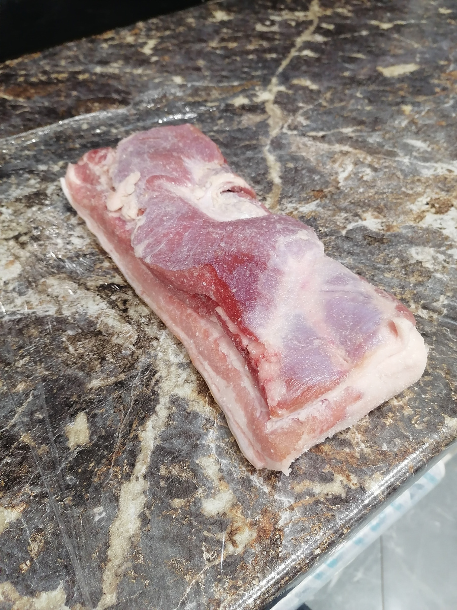 Всем доброго вечера! Есть большой плюс, когда каждый день ходишь на работу, домой приходишь вечером и тебе ничего не хочется делать. Ну и естественно себя удобно держать в руках. Но в выходные руки чешутся и что то хочется сделать. В прошлое воскресенье мне захотелось вкусной домашней нарезки на хлебушек, а в магазине как раз красивый кусок пашины попался. Вечером того же дня я ее засолила, на 1 кг мяса 10 грамм нитритной соли и 10 грамм обычной крупной соли. Грудинку помыть, обсушить, натереть солью и плотно обмотать пленкой. Сверху для удобства пишу дату, чтобы отсчёт вести. Убираю в холодильник на нижнюю полку на 6-7 дней. Далее достаю и натираю смесью приправ. У меня паприка, перец чёрный молотый, чеснок сушеный. Укладываю в стеклянную форму для выпечки, вставляю в центр грудинки термометр и отправляю в духовку. Температуру ставлю 140-150 градусов и ждем когда на термометре который в мясе будет температура 50-60 градусов. По времени примерно стоит 4-5 часов. Этот процесс забыла