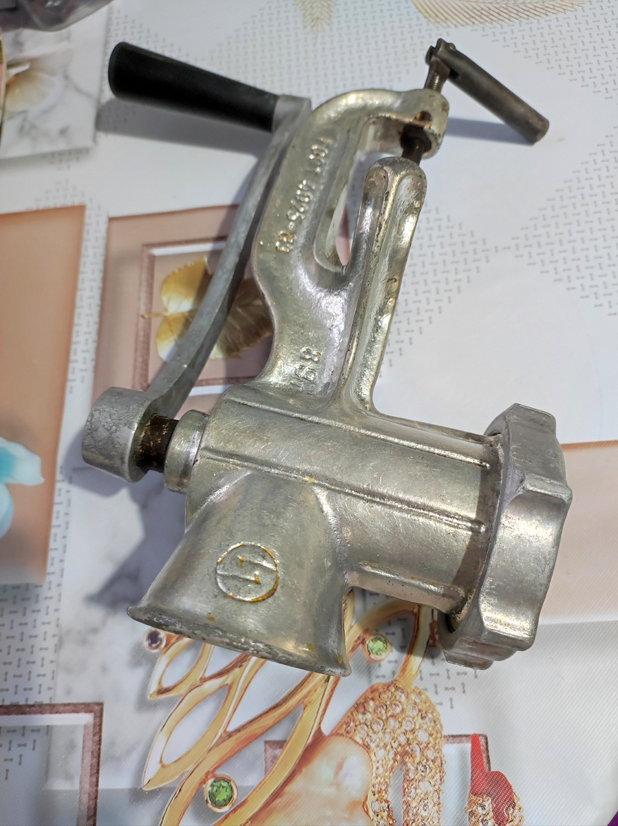 Вот и завершаются наши выходные. Я сегодня активно потрудилась и сделала немного полуфабрикатов в морозилку. У меня давно уже лежал пакет с замороженной речной рыбой - краснопёркой и щукой, поэтому я решила пустить её в дело, накрутить фарш и налепить котлет. У меня есть электрическая мясорубка, но речную рыбу я почему-то всегда пропуская через старенькую ручную, вот такая моя помощница, цена стоит 6 р. 15 коп.