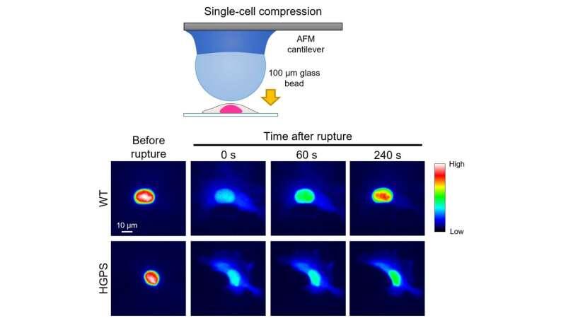 Исследователи из Института нанотехнологий жизни (WPI-NanoLSI) Университета Канадзавы сделали важное открытие о роли белка ламина А в защите ДНК клеток. Их работа, опубликованная в журнале PNAS Nexus, проливает свет на механизмы восстановления ядерных оболочек и может стать основой для разработки новых методов лечения редкого генетического заболевания — синдрома прогерии Хатчинсона-Гилфорда (HGPS). Ядерная оболочка (NE) — это защитный барьер, который окружает генетический материал клетки. Он поддерживается ядерной пластинкой (NP), состоящей из ламинов. Ламин А (LA) и ламин С (LC) являются ключевыми компонентами этой структуры. В случае разрывов в NE, ламин С быстро накапливается в поврежденных участках, способствуя восстановлению. Однако ламин А демонстрирует более медленную и слабую локализацию. Синдром прогерии Хатчинсона-Гилфорда — это редкое генетическое заболевание, при котором происходит преждевременное старение организма. Мутация в гене LMNA приводит к образованию дефектного вари