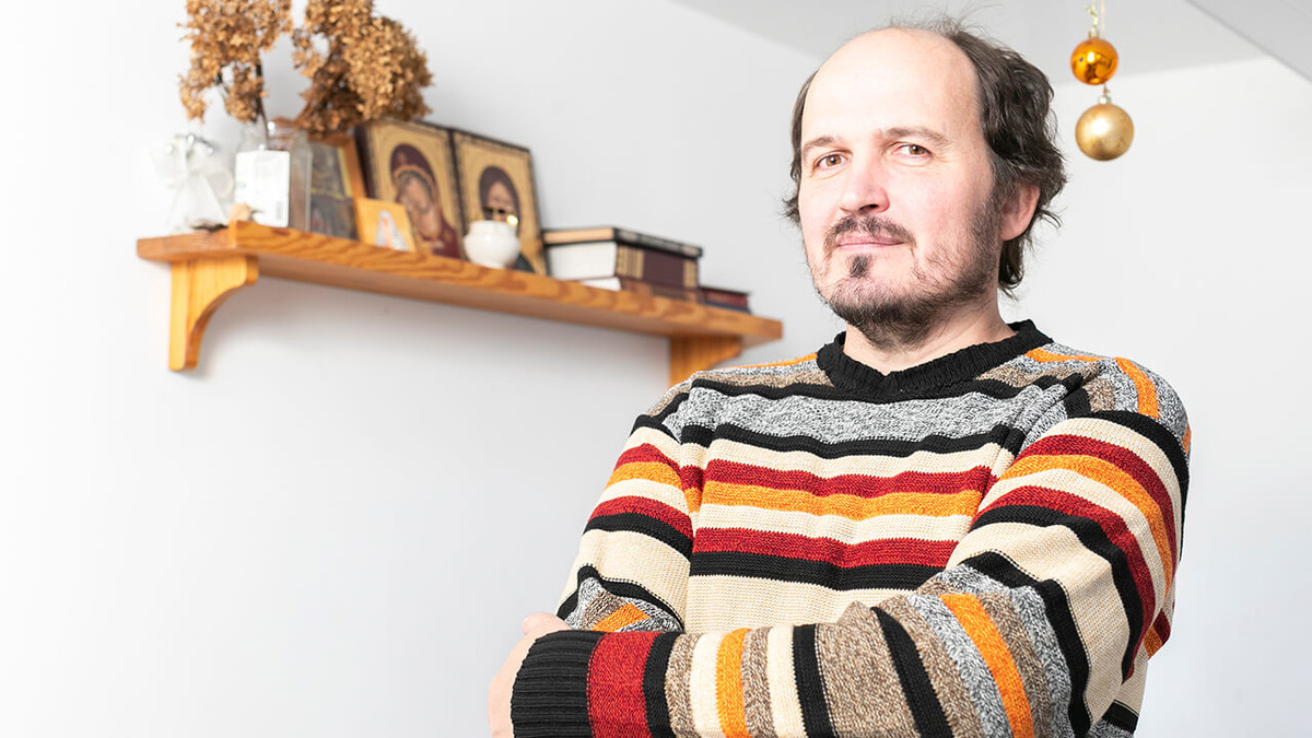 Сергей Шабуневич — художник. Он работал на игрушечной фабрике, был иллюстратором книг, делал игрушки из стекла в стеклосувенирной мастерской. А сейчас делает панно. На его столе выложены начатые работы. Сергей говорит, что работает очень медленно и что любое творчество для него связано одновременно со страхом и радостью. Как и его кинопоказы в монастыре под названием «Киноновинки».