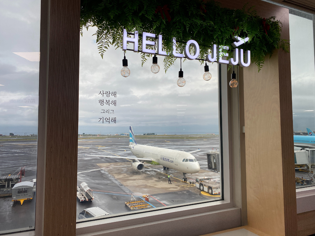 До аэропорта мы добрались по пустынным улицам города. Чеджу хоть и провинция, но далеко не деревня. Очень уютный и чистенький город, везде есть тротуар, пальмы. Мы первый раз в тропическом регионе в сезон, когда не душно, а температура держится в районе 15 градусов тепла. Очень комфортно, хотя в тот день и накрапывал мелкий дождик.
