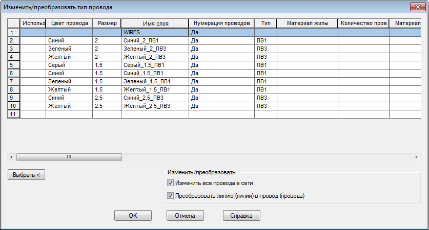 Инструмент «Изменить / преобразовать тип провода» позволяет изменить типы проводов для выбранных на чертеже соединений, а также преобразовать линии AutoCAD в провода AutoCAD Electrical. Изменение типов проводов происходит в результате смещения существующих на чертеже соединений в выбранный слой типов проводов. Преобразование линий AutoCAD в провода AutoCAD Electrical происходит путем изменения слоев для графических объектов на выбранный слой для проводов. После запуска инструмента открывается диалоговое окно «Изменить/преобразовать тип провода». Таблица типов проводов диалогового окна «Изменить/преобразовать тип провода» аналогична таблице диалогового окна «Создать/редактировать тип провода»: в ней отображаются все слои проводов чертежа. Однако параметры типов проводов в окне «Изменить/преобразовать тип провода» являются справочной информацией и не могут быть изменены. Диалоговое окно «Изменить/преобразовать тип провода» содержит следующие опции: · Выбрать - Нажатие кнопки «Выбрать» пр