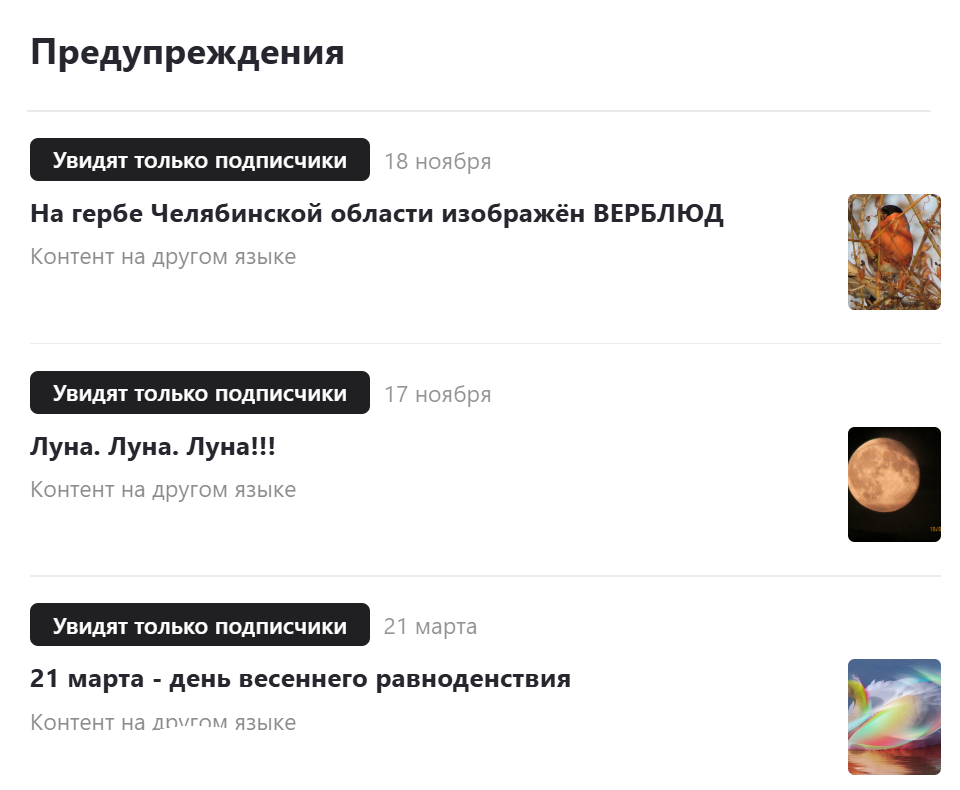 После операции по замене хрусталика мне нельзя было смотреть и читать тв и компьютер. Ну и бумажные записи, конечно, тоже. И чтобы продолжить ряд ежедневных выпусков тем на канале, я решила поделиться с подписчиками своими фотографиями, потому что есть очень красивые, и их много. И они улучшают настроение. Но я недавно научилась проверять содержание раздела "предупреждения", и обнаружила, что мои фотографии "написаны на другом языке". Из всего, что написано на другом языке, я увидела только одно слово. Это слово КОНТЕНТ. И это иностранное слово применил сам дзен. Потому что КОНТЕНТ на наш родной русский язык переводится как СОДЕРЖАНИЕ. Скажите мне, кто-нибудь видит иностранное содержание в фотографиях неба-луны или птиц-животных? Если вы реально это видите, объясните мне, бестолковой! Очень прошу. А на дзен с его "другим языком" мне тьфу. Потому что я пишу по-русски. А какой язык является родным и не "другим", я уже догадываюсь. Наверное, пора на прямую линию Путину? Как думаете