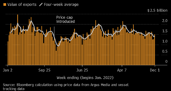Это действие совпало с планами США и ЕС ввести дополнительные санкции против российской нефти, о которых на этой неделе рассказали министр финансов США Джанет Йеллен и агентство Reuters. Желтым — морской экспорт нефти из РФ (в млрд USD в неделю), серым — среднее четырехнедельное значение данного показателя. Источник: Bloomberg На сайте Главного управления разведки Минобороны Украины (ГУР МОУ) появилась подробная информация о 238 танкерах, которые, как утверждается, входят в состав так называемого «теневого флота» РФ и используются для перевозки по миру российской нефти и нефтепродуктов. Это действие совпало с планами США и ЕС ввести дополнительные санкции против российской нефти, о которых на этой неделе рассказали министр финансов США Джанет Йеллен и агентство Reuters. «Теневой танкерный флот перевозит по миру растущие объемы санкционной нефти, обеспечивает многомиллиардные доходы РФ, Ирану, угрожает экологической безопасности в Мировом океане», — говорится в тексте. — «Подсанкционные