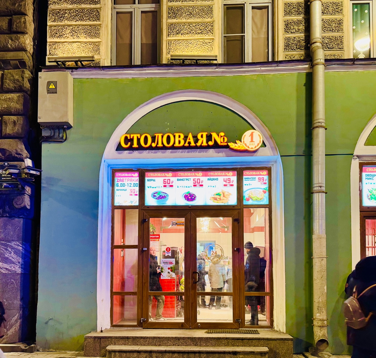Честный обзор самой известной сети столовых Санкт-Петербурга. Кафе и ресторанов на любой вкус, даже самый изысканный, в Питере великое множество! Но когда требуется просто перекусить, чтобы быстро и недорого, незаменимыми становятся столовые, которых в городе на Неве тоже достаточно много. Причем, в том числе, в историческом центре. В этот раз я заглянула в Столовую №1. Столовая №1 - это сеть из 10 столовых, находящихся на Невском проспекте и окрестностях. Я посетила ту, что находится на Невском проспекте, 5: Даже с улицы видно, насколько большую площадь занимает столовая. И работает она круглосуточно. Некоторые столовые этой сети также работают круглосуточно, другие - до 23.00 часов: На фасадах здания ярко горит реклама с заманчивыми ценами - борщ стоит 60 рублей за 300г, яичница - 30 рублей утром во время завтрака. Но судя по полному залу, который виден даже с улицы, очень приемлемые цены здесь должны сочетается с нормальным качеством продуктов. И так как я все равно искала заведе