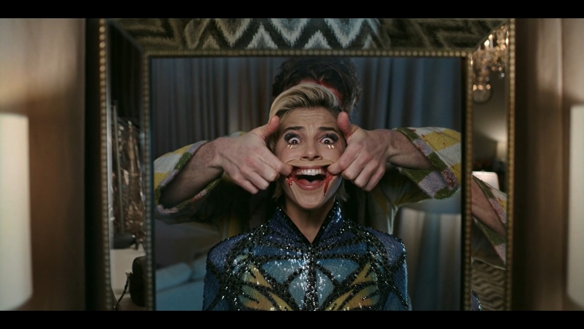 Два года назад режиссёр Паркер Финн на базе самых заурядных хоррор-пугалок и узнаваемых концептов создал на удивление жуткое и изобретательное кино, которое одновременно пугало и любопытно транслировало, как травмы буквально ломают и пожирают. Вторая часть «Улыбки» не только углубилась в метафору травм, но и технически стала выглядеть гораздо изобретательней и приятней. Наконец, когда у режиссёра Финна появился внушительный бюджет, у фильма стал проглядываться его эстетичный визуальный язык и стиль. Но не только картинка фильма стала радовать глаза, но исполнительница главной роли – актриса Наоми Скотт, которая помимо того, что очень красивая, но и пластичная как в эмоциональных сценах, так и в танцевальных. Плюс актриса сама профессиональная певица, что дополняет гармонию в происходящие события. Мимический спектр Скотт настолько разнообразен, что каждый эмоциональный удар очеловечивает её героиню. Касательно самой темы травм, то она ушла в область тёмной изнанки шоу-бизнеса, где медий