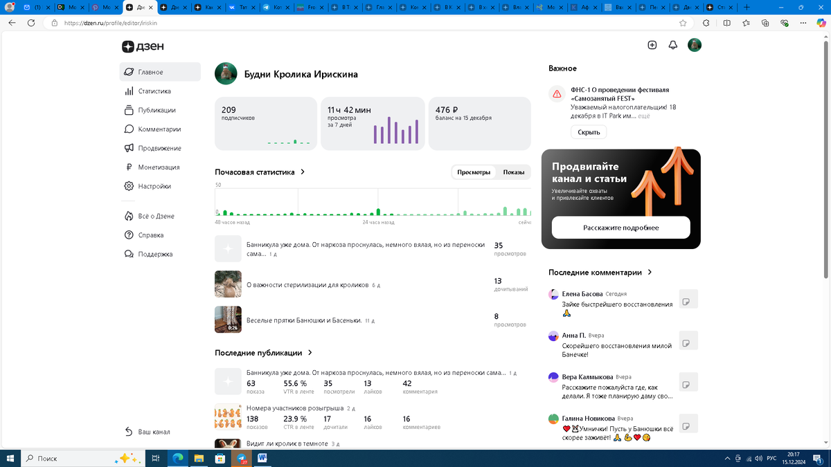 Год заканчивается, а у нас давненько не было статей о том, как дзен относится к блоггерам. Итак, как вы помните, в начале октября мой канал, наконец. стал достоин монетизации. За 3 месяца я не заработала даже полных 500 рублей - ни на что не намекаю, ни к чему не призываю, просто констатирую факт. Статистика тоже "радует" - кто-нибудь верит, что при 1500 показах видео, где Банникула и Баскервиль играют в прятки за шторой, видео посмотрело даже менее 10%. Вот и я о том, тем более, что при просмотре старых видео выяснилось, что дзен снимает лайки - мои личные, а также некоторых подписчиков. Далее, что интересно. На очередную статью я схлопотала бан за медицинскую информацию. Напоминаю, что это статья о том, как я вылечила Баняшку от соплей. Можно просмотреть ее по новой - там нет никаких названий лекарств, нет точных дозировок, да и диагноз тоже не подтвержден, в целом. Просто написано о том, что ушастая перестала чихать и сопливить, а на повторный прием мы решили не ходить. В прошедший