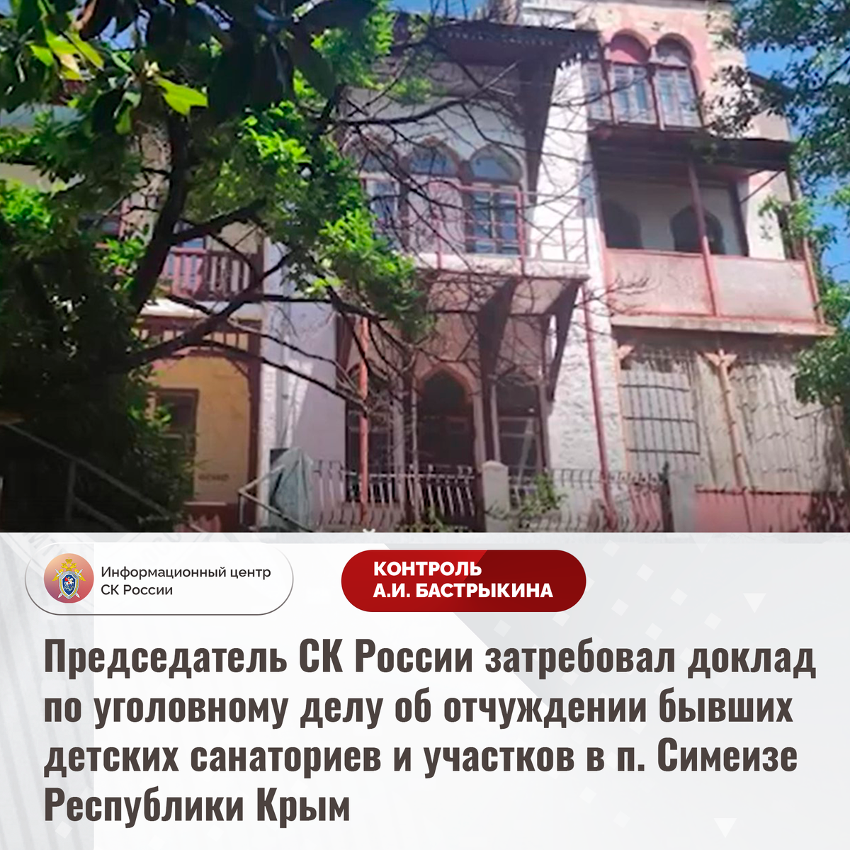 Председатель СК России затребовал доклад по уголовному делу об отчуждении бывших детских санаториев и участков в п. Симеизе Республики Крым В Информационный центр СК России поступило обращение о несогласии с результатами установления обстоятельств реализации объектов недвижимости в поселке Симеизе Республики Крым. В 2021-2022 годах принято решение об отчуждении бывших детских санаториев «Юность», «Красный маяк» и «Пионер», а также земельных участков, на которых они располагаются, в частную собственность третьих лиц. При этом часть выкупленных корпусов санатория «Юность» имеет статус памятников архитектуры, нуждающихся в реконструкции, а другая часть более полувека назад была заселена бывшими сотрудниками здравницы. В результате местные жители лишились беспрепятственного доступа к собственным домам, историческим зданиям и береговой линии. Многочисленные обращения результатов не принесли. Ранее указанная ситуация освещалась в СМИ. А.И. Бастрыкин ставил ее на контроль в центральном аппар