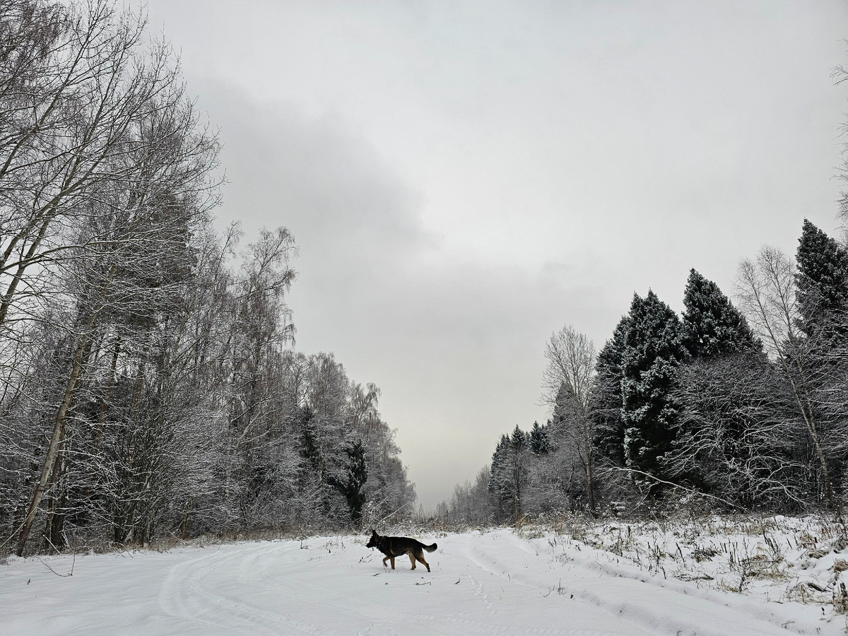 Дни однообразны и серы. Солнце уже давно не пробивалось сквозь пелену тяжелых и сырых облаков. Порой казалось, что они летят так низко, чуть ли не чиркают макушки елей. И вдруг повалил снег... Всё побелело, тонет в белом молоке. Березы, только что стоявшие обнаженными, укрылись легким пуховым покрывалом. Снег всё идет: тихий, мягкий. Он, словно невидимый художник, преобразил мир волшебными кистями, смыл серость и уныние, и осветил всё кругом серебристо-жемчужными тонами. Посветлело! А снег только раззадорился, продолжает падать. Уже навалило по щиколотку. Чувствуется сильный запах холода и свежести. Лес оцепенел, кажется безлюдным. Но это обманчиво. Здесь кипит незаметная для наших глаз жизнь. То тут, то там бежит лисья строчка, возле сухой травы отчетливо видна мышиная вышивка, здесь остался след от птичьего крыла… Взгляд привлекло волнообразное и быстрое движение у вороха сухой травы. Показалось, будто там промелькнула белая змейка. Мы с Греем замерли, всматриваемся. На белом покрыв