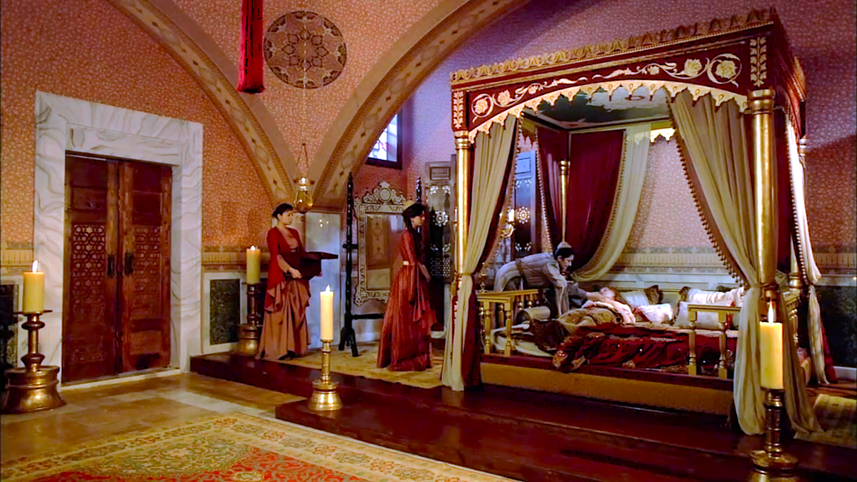 Хюррем с пострадавшим от рук Махидевран лицом приводят в покои Султана. Рядом с ней лекарша, Нигяр Калфа и ещё служанка.