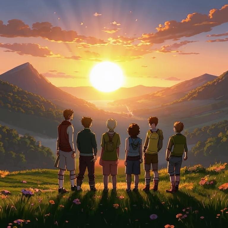 Герои стоят вместе на вершине холма, глядя вдаль на горизонт. За ними простирается бескрайнее небо, окрашенное теплыми оттенками заката. Ветер мягко колышет траву у их ног. На лицах героев читается уверенность и надежда. Они знают, что впереди их ждут новые испытания, но верят в силу своей любви и готовность преодолевать любые трудности. Кадр 1: Камера медленно поднимается от земли к небу, показывая героев, стоящих на вершине холма. Голос за кадром: