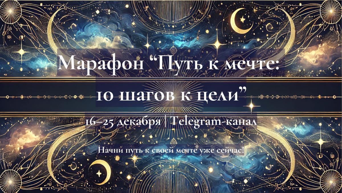 Этот день знаменует собой переломный момент года, когда ночи становятся короче, а свет занимает всё больше места в нашей жизни. 🌞 А ещё скоро Новый год — время, когда все мы ждём волшебства, загадываем желания и мечтаем о переменах. 💫 У меня для вас есть предложение! Я регулярно делаю самые разные практики в энергетически сильные дни года. Это помогает мне не только мечтать, но и действовать, чтобы желания исполнялись! В этом году я решила не делать это в одиночестве, а собрать тёплую компанию людей, готовых «поработать» со своими желаниями и сделать первые шаги к их реализации. Как вам идея? ✨ 🎯 Приглашаю вас принять участие в марафоне "Путь к мечте: 10 шагов к цели"! 📅 Когда: с 16 по 25 декабря. 📍 Где: мой Telegram-канал https://t.me/iren_magic_world.