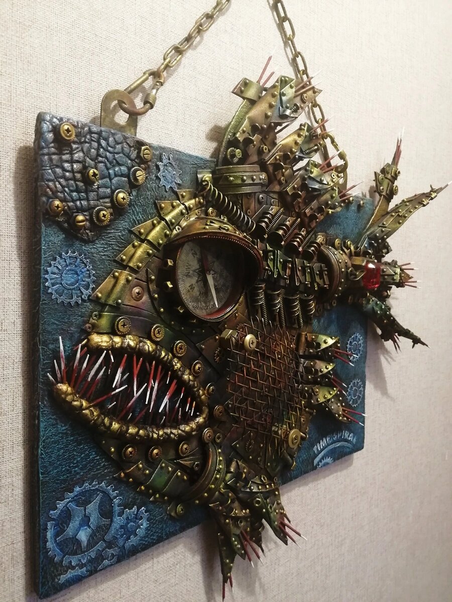 Что такое Стимпанк для меня, как для человека творческого... Это яркий стиль старины в современности. Я закрываю глаза и вижу причудливые механизмы. Всяческие двигатели внутреннего сгорания. Дирижабли необычной формы. Машины с паровыми двигателями. Совершенно невообразимая техника. Сюртуки и часы на цепочке с вращающимися шестерёнками. Трубы, цепи, пружины, винты, гайки, ржавое железо и потёртая кожа, лампы накаливания и плазменные шары, старые книги и карты. Нереальные зубастые рыбы. И многое - многое другое. Это фантастика! Стимпанк очень популярен и в наше время. В этом направлении работают множество художников. И я не исключение - Стимпанк я обожаю. И если бы я была помоложе, то у меня обязательно был бы костюм или платье в этом стиле. Но у меня есть моё творчество и там я могу воплотить свои фантазии и хотелки. А если вы тоже хотите попробовать себя в этой технике и не знаете с чего начать, обращайтесь ко мне и я вам обязательно помогу. И так, предлагаю вашему вниманию свои работы