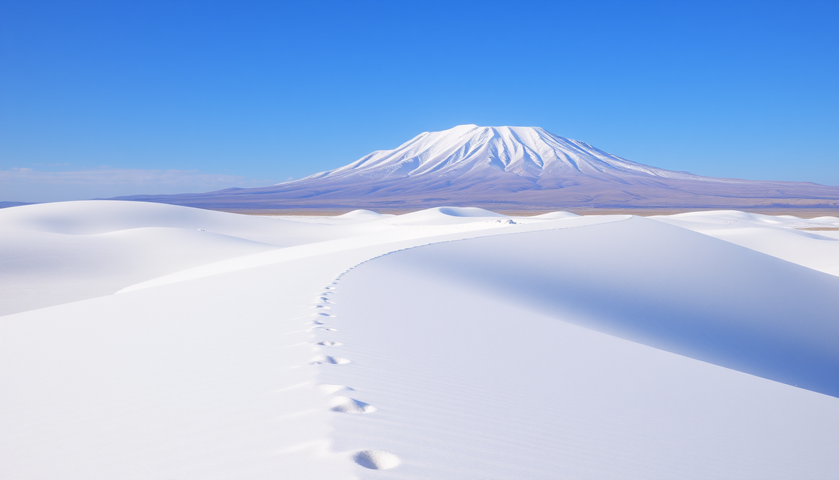 - Пустыня зимой похожа на картину, написанную в стиле минимализма. Снег укрывает песчаные барханы, превращая их в снежные волны. Сопка Большое Богдо — самая высокая точка Каспийской низменности — выделяется своими красными склонами, контрастирующими с белоснежной степью. А соляное озеро Баскунчак, сверкающее ледяными кристаллами, выглядит как гигантское зеркало, которое отражает всё это великолепие.