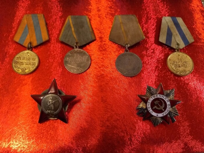 Сработал триггер на 9 мая. Медали прадеда. Освобождение Вены. Освобождение Будапешта. Здесь можно кое-что разобрать. На память, 1945. Прадед инвалид войны, контуженный. После мая 1945 года их отправили на восточный фронт, во Владивосток в вагоне-теплушке. Вернулся и работал на руководящих должностях, связанных с санэпидем надзором и спортом. Он продвигал идею отказа от хлорной дезинфекции воды, сам такую не пил. Отец рассказывал, в кабинетах над ним насмехались.... Но в 60-80е годы так не умели. И так и не сделали. Он привык за годы войны, да и до, и после, к воде из колодца или родников, уважал гречневую кашу на такой воде. Я когда приезжал в родной город сразу из родника выпил студёной, как в детстве. Также он говорил как бывший служащий медсанбата во времена ВОВ, что, действительно, были сто грамм фронтовых - медицинских спирт. На штурмы давали. Цель чисто медицинская: санация брюшной полости при ее ранениях. (другая цель наверное поднятие боевого духа.) Мой любимый добрый дед, слов