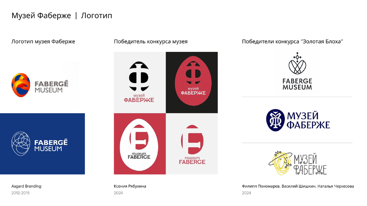 ✦ Конкурс: 4 апреля 2024 Музей Фаберже объявил открытый творческий конкурс на создание нового логотипа. С 2012 года музей использует логотип, разработанный компанией Asgard Branding. В данный момент этот же логотип используется на сайте. ✦ Результат: В июне Музей Фаберже подвёл итоги конкурса. Из 670 работ выбран знак студентки 1 курса кафедры графического дизайна СПбГУ Ксении Рябухиной. ✦ Также итоги: 1649 недовольных комментариев к новости о результатах конкурса в канале Музея. Плюс, бесчисленные обсуждения и возмущение в дизайн коммюнити: логотип сырой и имеет сходство с другими работами с конкурса. Считаю возмущение весьма оправданным! ✦ Но дальше еще интереснее: осенью в рамках конкурса логотипов «ЗОЛОТАЯ БЛОХА» осуществлён альтернативный выбор знака Музея Фаберже. 💫Организаторы конкурса создали отдельную номинацию "Лучший знак для Музея Фаберже", а профессиональное жюри руководствовалось стандартными критериями, прописанными в Положении и применяемыми к оценке конкурсных знаков