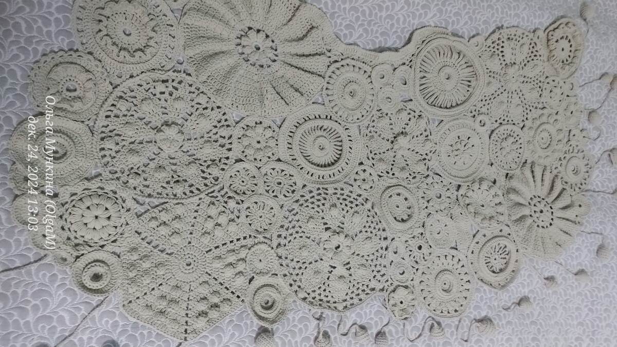 проделан огромный труд и милая девушка получит для себя любимой отличный подарок, как она говорит "Достойное вложение" Палантин в разложенном виде и на этом фото настоящий цвет Экрю Первая шаль больше похожа на накидку - пончо с большим воротником стойкой. Вязала по примеру и схемам,которые разместила в этой