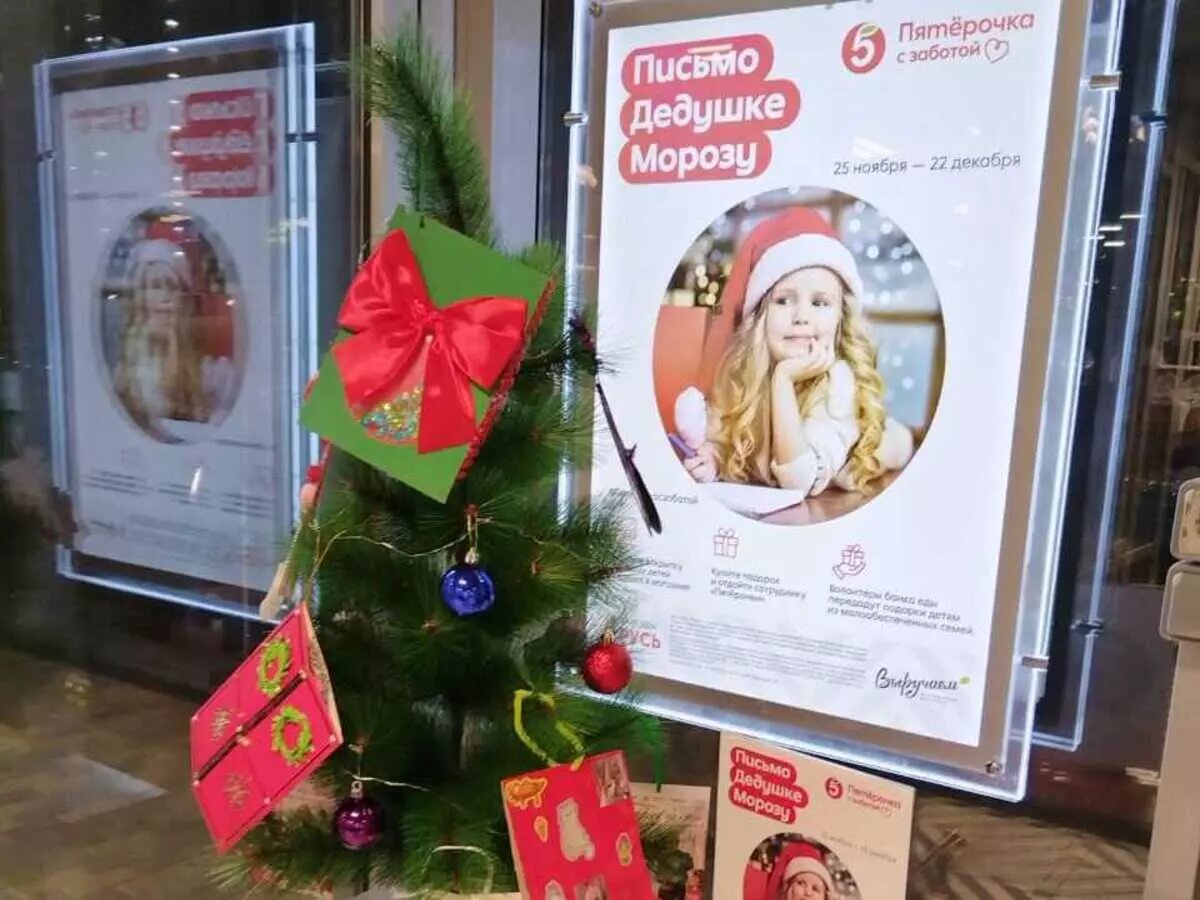 В этом году в более 200 магазинов торговой сети «Пятёрочка» уже установили новогодние елки с открытками. Каждая карточка — это письмо главному новогоднему волшебнику, в котором ребенок пишет о своей мечте. Гости могут выбрать любую открытку, приобрести указанный в ней предмет и передать его сотрудникам ритейлера. Полученные подарки волонтеры фонда «Русь» заберут из торговой сети и организуют новогоднее мероприятие для детей в отделениях фонда. На новогоднем празднике Дед Мороз и Снегурочка вручат их ребятам.