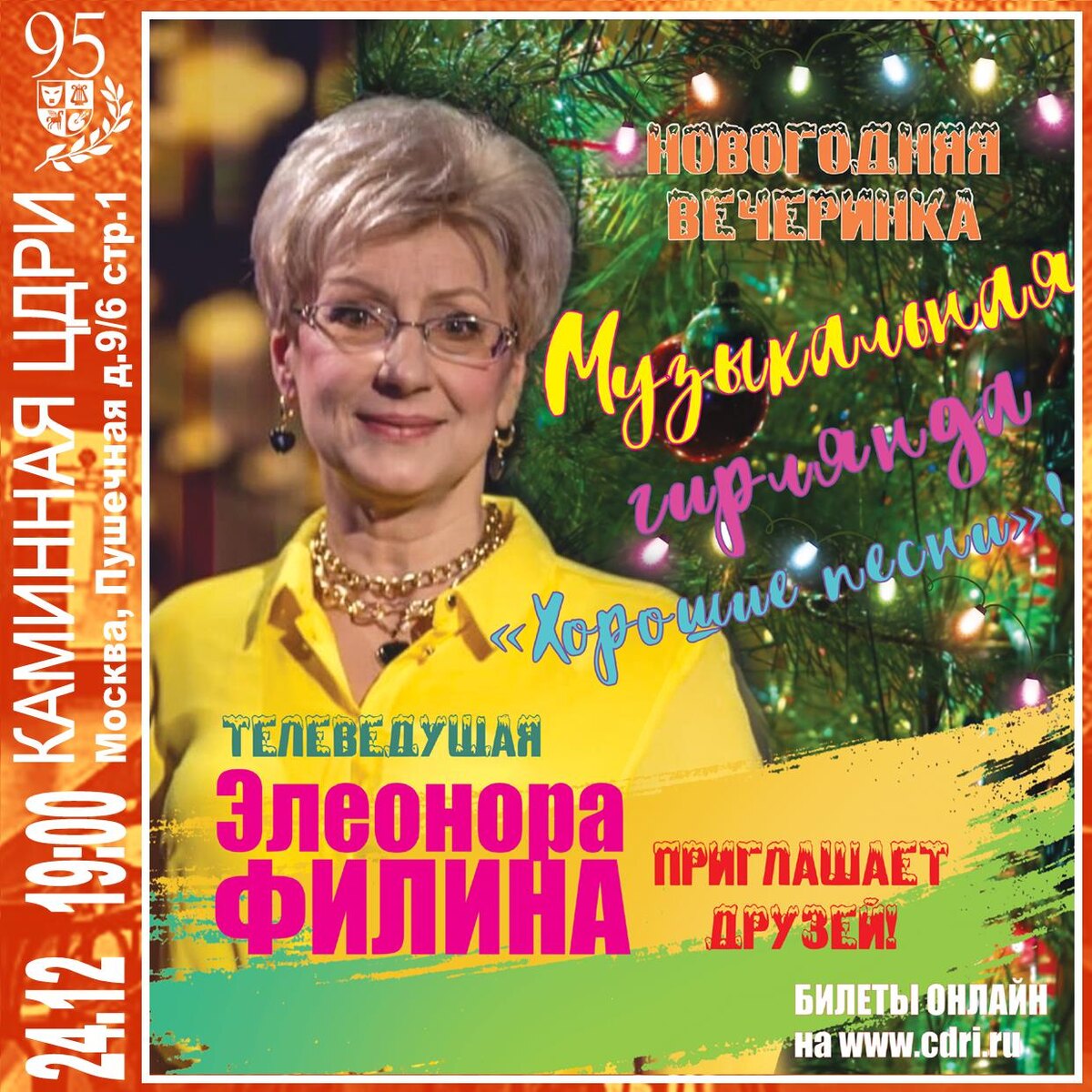 Новогодняя вечеринка — Музыкальная гирлянда «Хорошие песни» Телеведущая Элеонора ФИЛИНА приглашает друзей! Билеты на сайте: https://cdri.ru/afisha/dekabr-2024/novogodnyaya-vecherinka.html