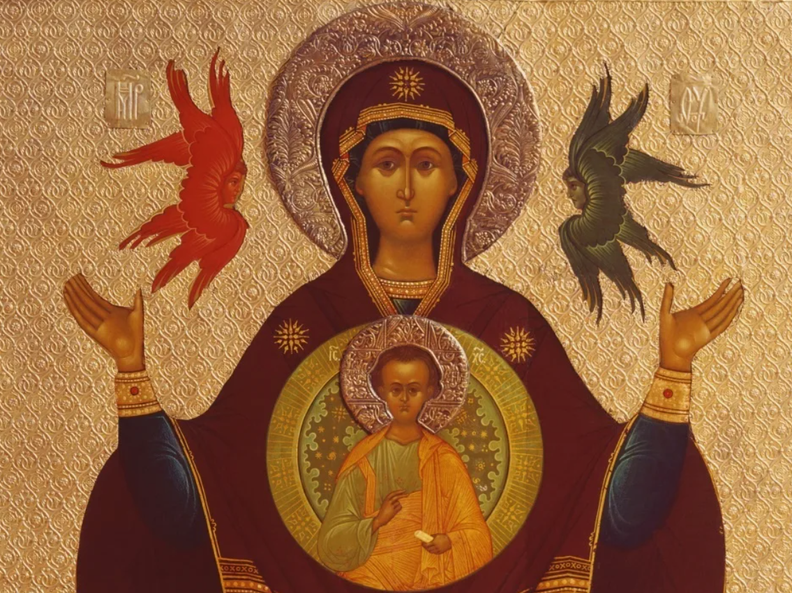 На иконе "Знамение" Матерь Божью пишут сидящей и молитвенно воздевающей руки к небу. На груди Ее изображают сферу, из которой смотрящего на образ благословляет Младенец – Спас-Эммануил.