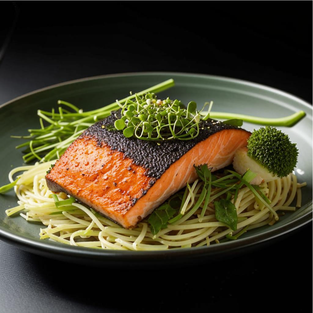 Ингредиенты: 200 гр отваренной фунчезы; 100 гр грибов вешенок; 30 мл соевого соуса; 30 мл меда; 3 ст.л оливкового масла; 2 порционных кусочка семги(стейки); Перец чили , соль по вкусу. 30 гр микрозелени. Приготовление: Соевый соус смешать с медом, добавить перец и замариновать семгу на 40 минут. Вешенки посыпать солью, полить маслом и тоже оставить мариноваться. Форму выложить пергаментом, смазанным маслом, уложить туда фунчезу, перемешанную с вешенками, сверху семгу, накрыть сверху пергаментом так, чтобы получился конверт. Запекать 35 минут при температуре 200 градусов. Посыпать микрозеленью. Приятного аппетита!